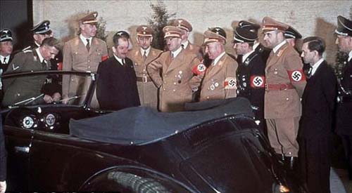 讨好元首:在希特勒50岁生日时,奥地利汽车制造商保时捷(左边,着黑色西服)向希特勒赠送了一辆新设计的敞篷大众汽车。